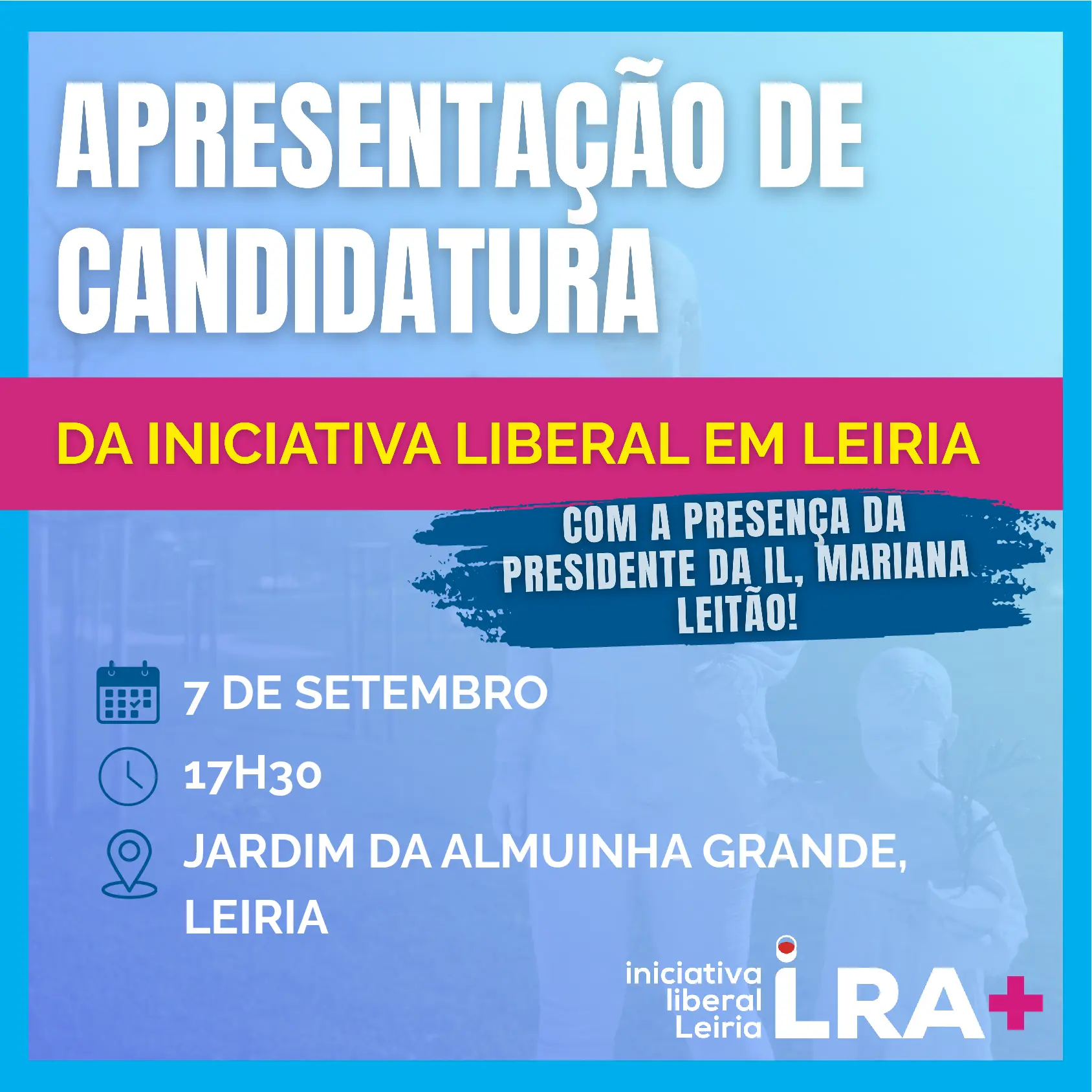 No próximo 7 de setembro, às 17h30, vamos apresentar oficialmente a nossa candidatura à Câmara Municipal, Assembleia Municipal e Freguesias de Leiria.