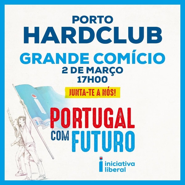 Já este sábado, dia 02 de Março, às 17h00, no Hard Club no Porto, teremos mais um momento de celebração dos valores liberais, fundamentais numa democracia que se quer livre, justa e inclusiva. É mais uma oportunidade para levarmos as nossas soluções para pôr Portugal a crescer e a funcionar a todos os portugueses: um grande comício com várias intervenções dos nossos candidatos e do Presidente da Iniciativa Liberal e, também, muita animação.