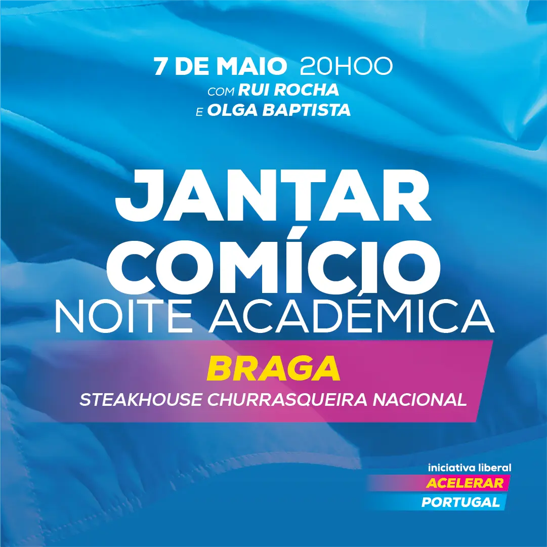 Às 20h juntamos os liberais do distrito de Braga num grande jantar-comício no restaurante Steakhouse Churrasqueira Nacional. Mais tarde, a noite continua na emblemática Noite Académica de Braga.