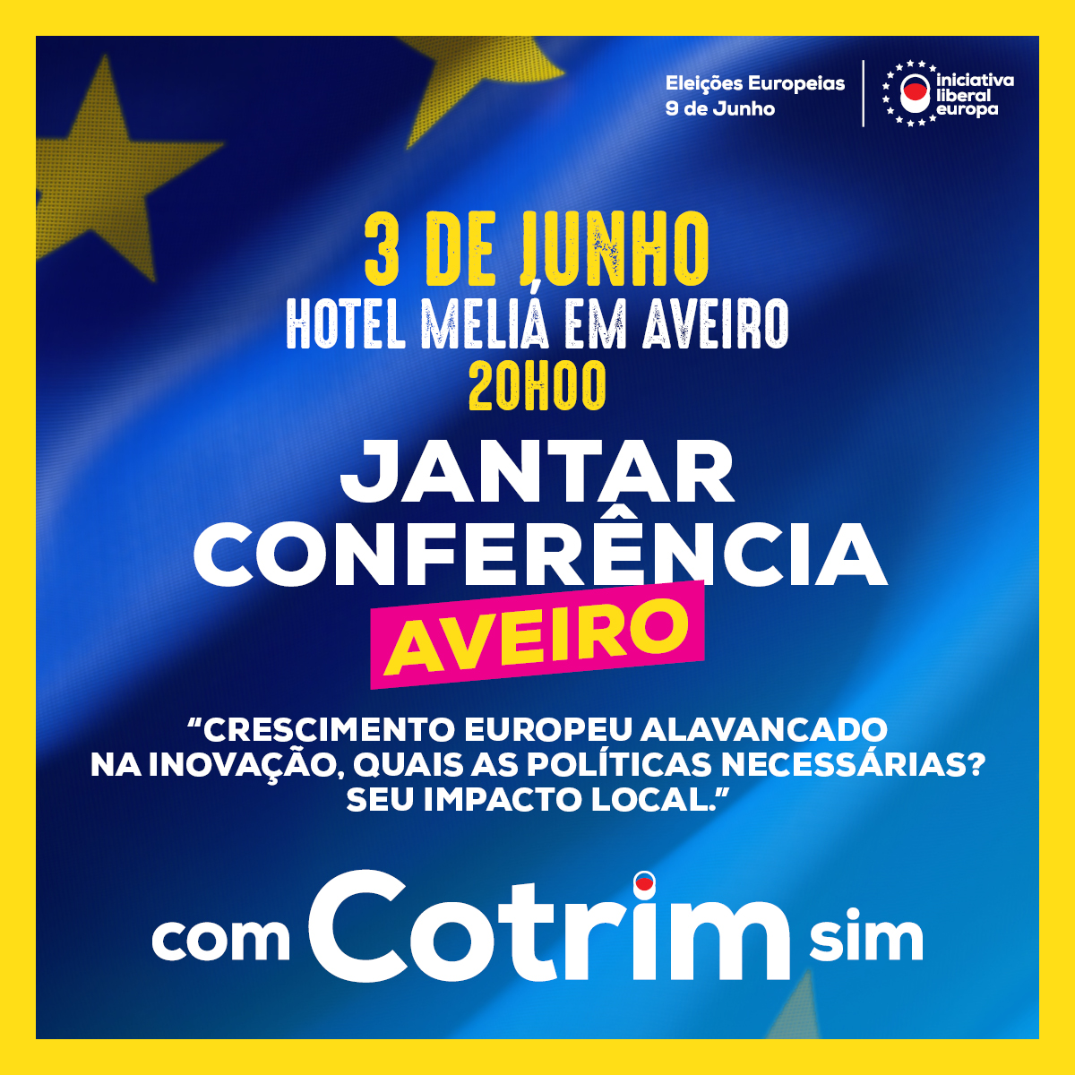 Vem fazer parte desta campanha , segunda-feira, dia 3 de junho, pelas 20h00, no Hotel Meliá em Aveiro, num jantar conferência com a presença do cabeça de lista da Iniciativa Liberal às eleições europeias, João Cotrim Figueiredo, e outros convidados, sob o tema “Crescimento europeu alavancado na inovação, quais as políticas necessárias? Seu impacto local.”