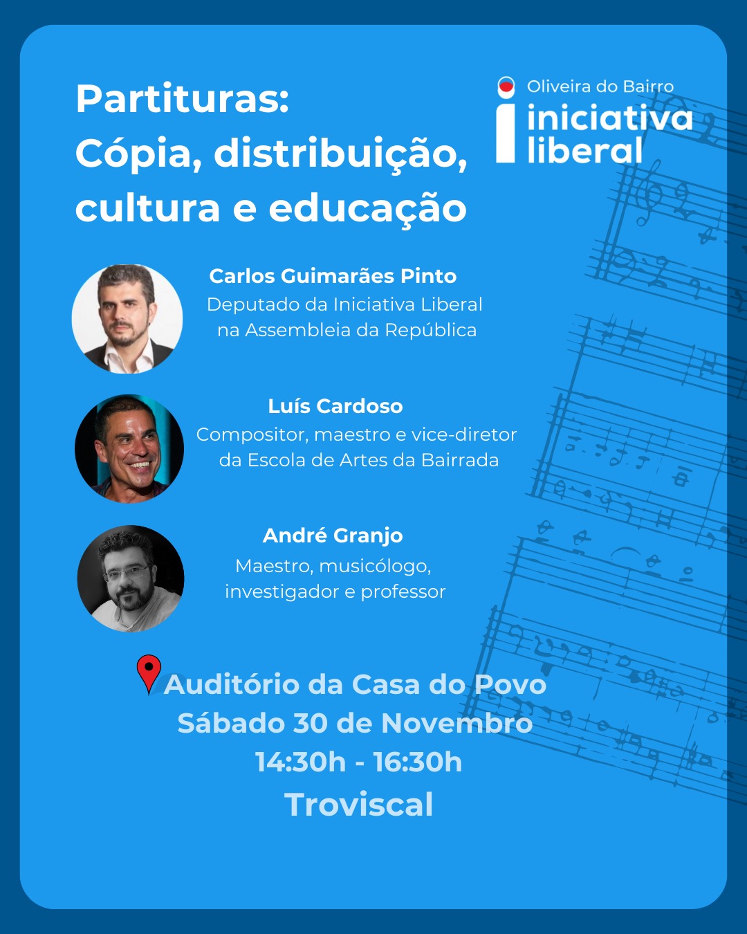 No próximo dia 30 de novembro (sábado), das 15:00 às 17:00 (nova hora), convidamo-lo a participar na conferência "Partituras: Cópia, distribuição, cultura, educação", que terá lugar na Casa do Povo, no Troviscal.