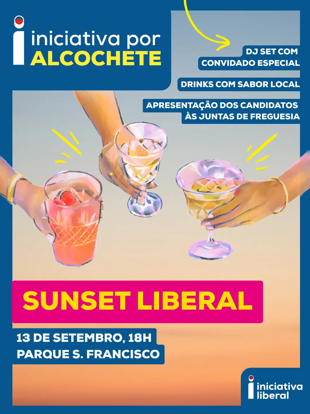No próximo dia 13 de setembro às 18h, convidamos todos os alcochetanos, liberais e amigos a juntarem-se a nós no Parque de São Francisco, junto ao centro escolar, para um final de tarde diferente e especial.